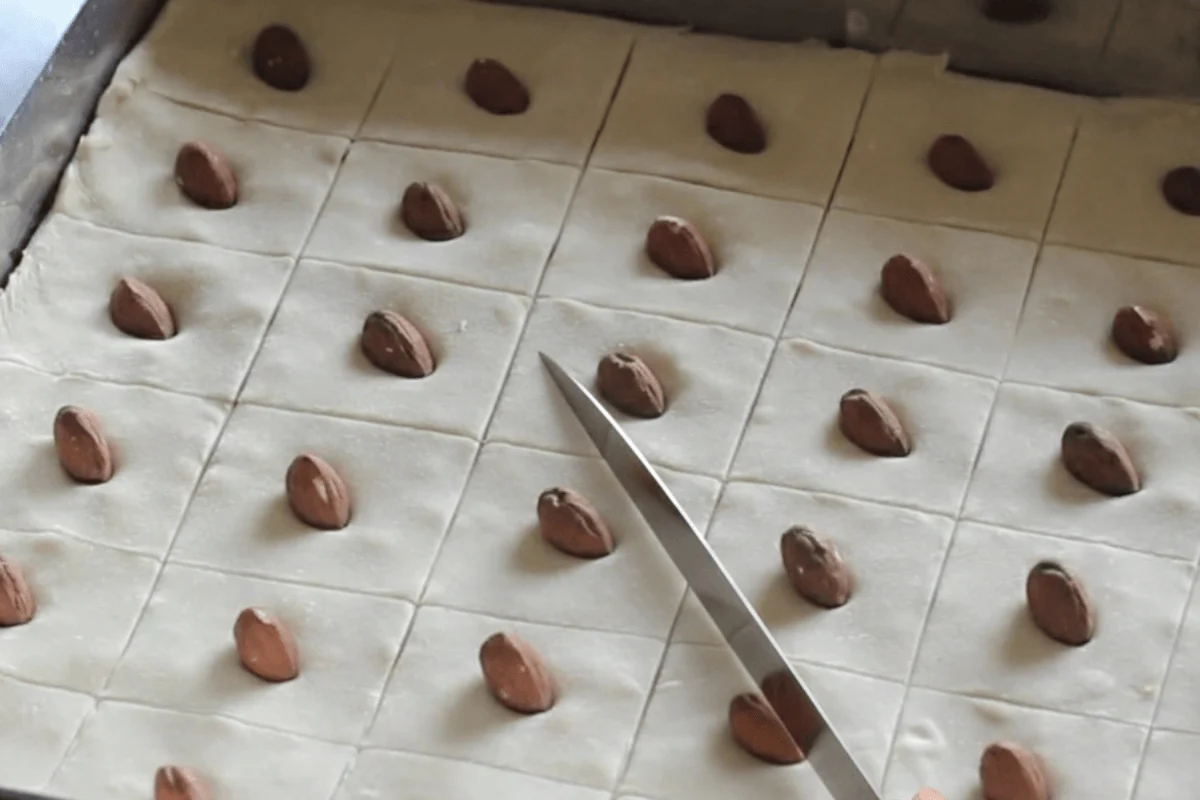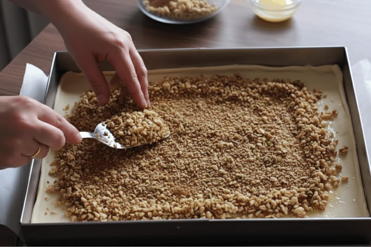 - Drop a thin nut layer; repeat with 5 phyllo sheets, more nuts, till you're out, top with phyllo stack.