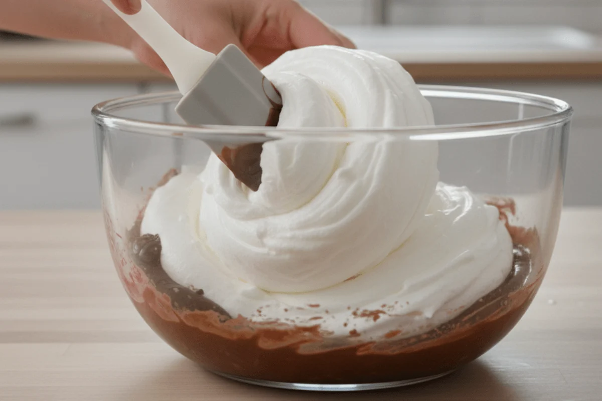 Snag a silicone spatula and do this scooping and lifting motion: cut down the middle, grab from the bottom, and flip it over gently. First, mix in a bit of the whipped mixture to lighten the chocolate batter, then fold the rest super carefully. It is like tucking in a baby—gentle, or it all deflates.
