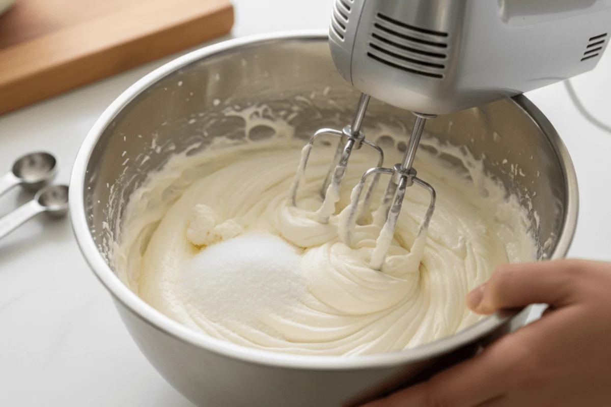 - In your bowl, whip cream cheese, sour cream, sugar, and vanilla till it's fluffy frosting heaven – mixer makes it a breeze.