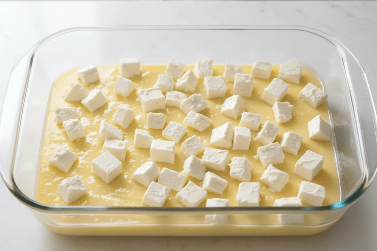 - Toss cream cheese cubes all over it like confetti.