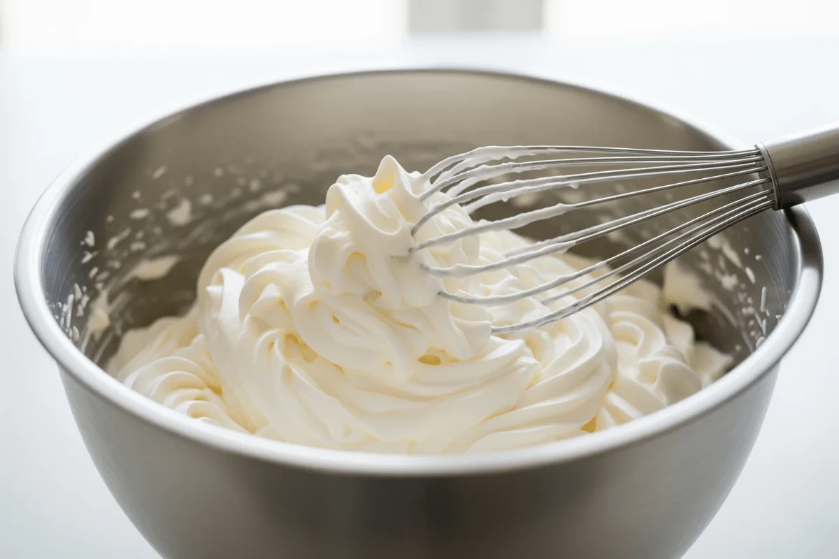 - In a chilled bowl, whip heavy cream with powdered sugar and vanilla until soft peaks form.