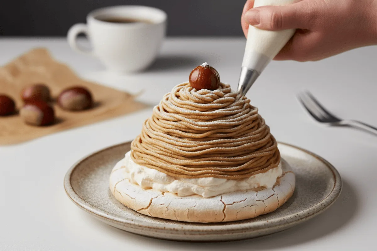 - Cover the whipped cream with piped chestnut cream strands, spiraling to create the famous “mountain” look.