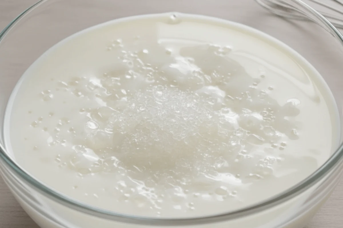 - Pour the milk into a small bowl, sprinkle the gelatin evenly on top, stir gently, and let it bloom (soften) for 10 minutes—no stirring needed yet.