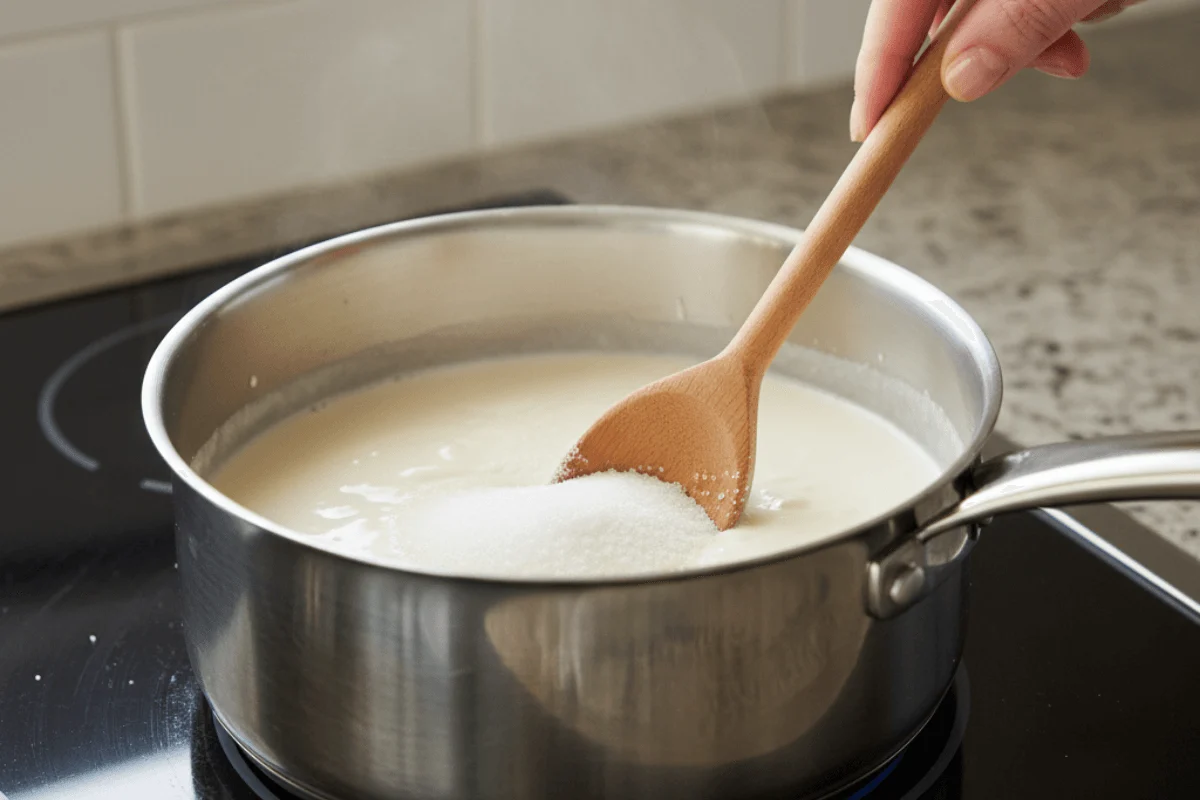- Add the bloomed gelatin mixture to the warm cream. Stir continuously over low heat for 1 minute until fully dissolved—avoid boiling.