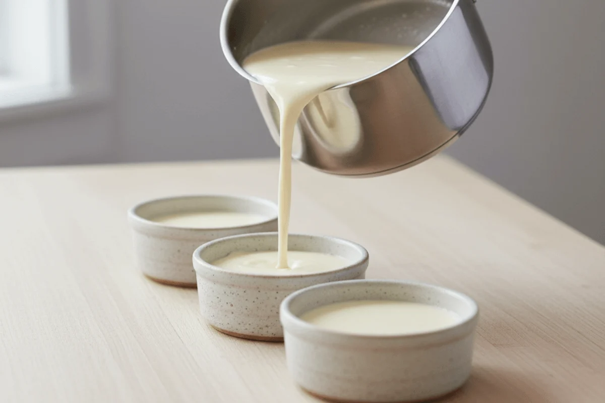 - Remove from heat, stir in the vanilla extract, and pour into ramekins or molds. Let cool uncovered at room temperature for 20 minutes (to prevent condensation), then cover with plastic wrap and refrigerate for 4 hours or overnight.